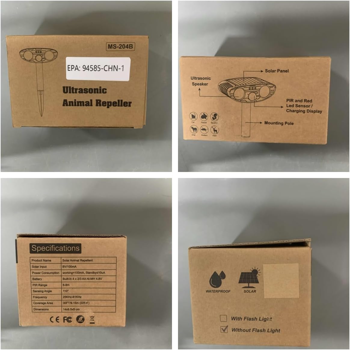 This 4-pack is a solar-powered, motion-activated ultrasonic deterrent designed to discourage common yard visitors such as cats, raccoons, rabbits, squirrels, skunks, and even deer without traps or chemicals. Each unit pairs a PIR motion sensor with an ultrasonic emitter and a brief LED flash so that deterrent cues only trigger when something enters the zone, keeping your garden quiet for people the rest of the time.