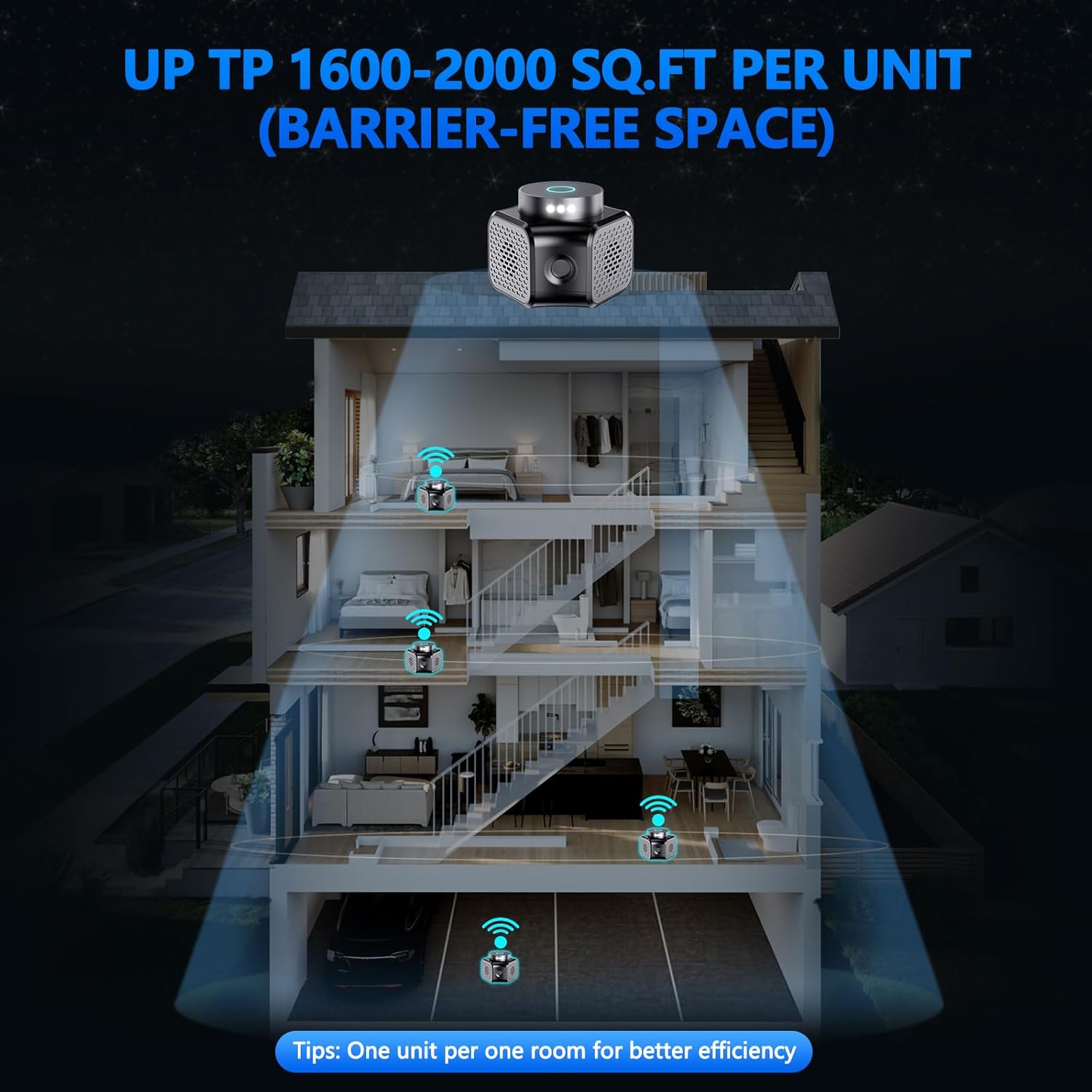 Sound does not pass through walls or solid doors. Think one unit per room or per open zone. Extension guidance and user manuals emphasize that soft furnishings absorb ultrasound and corners create dead spots, so plan coverage room by room rather than expecting a single device to protect a whole floor.