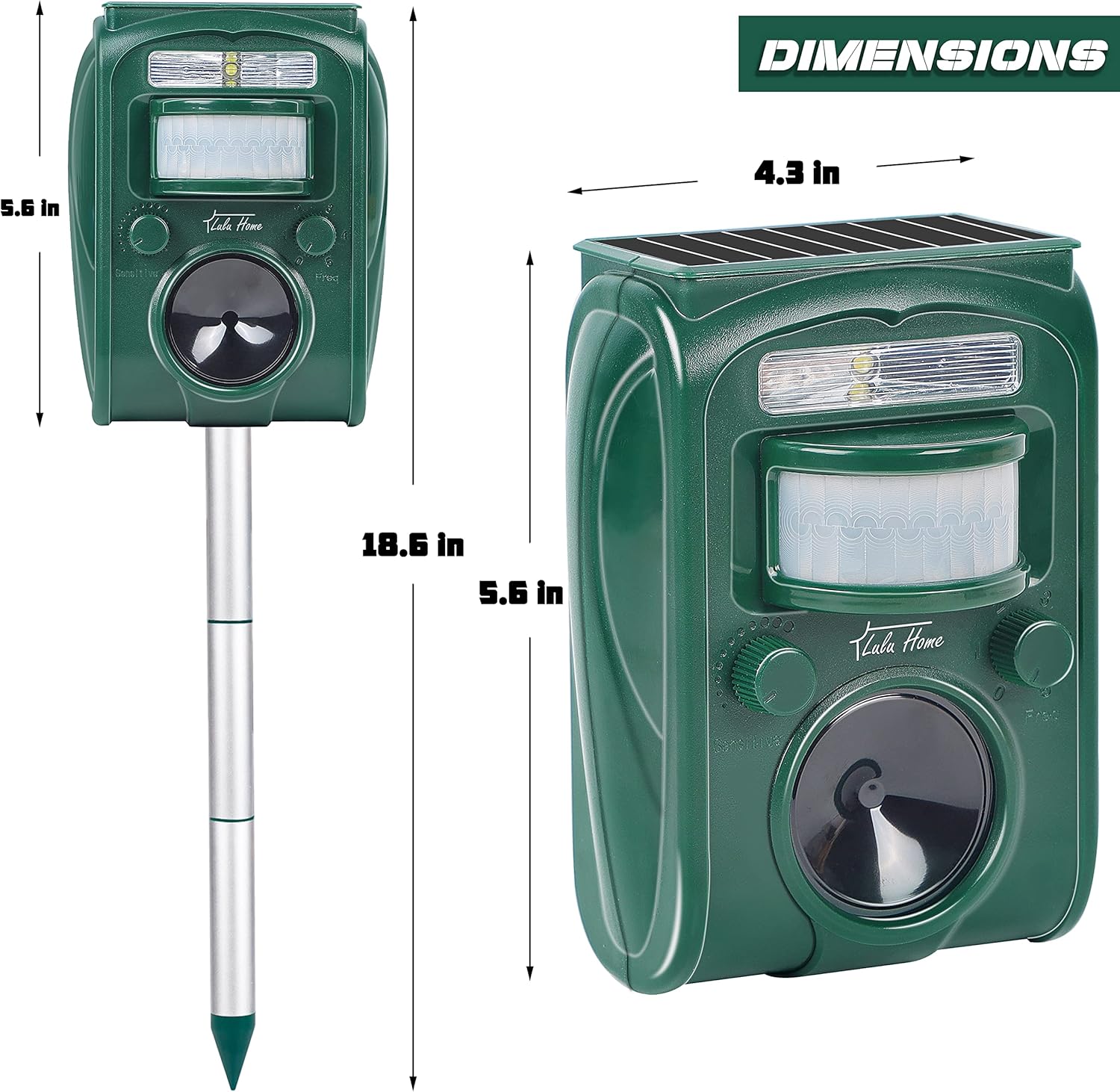 The Lulu Home 2 Packs Ultrasonic Animal Repeller is a pair of solar-powered, weather-resistant yard guardians that listen for movement and answer with sound and light. Each unit has a built-in PIR motion sensor, a speaker that emits adjustable ultrasonic frequencies, and bright strobing LEDs.