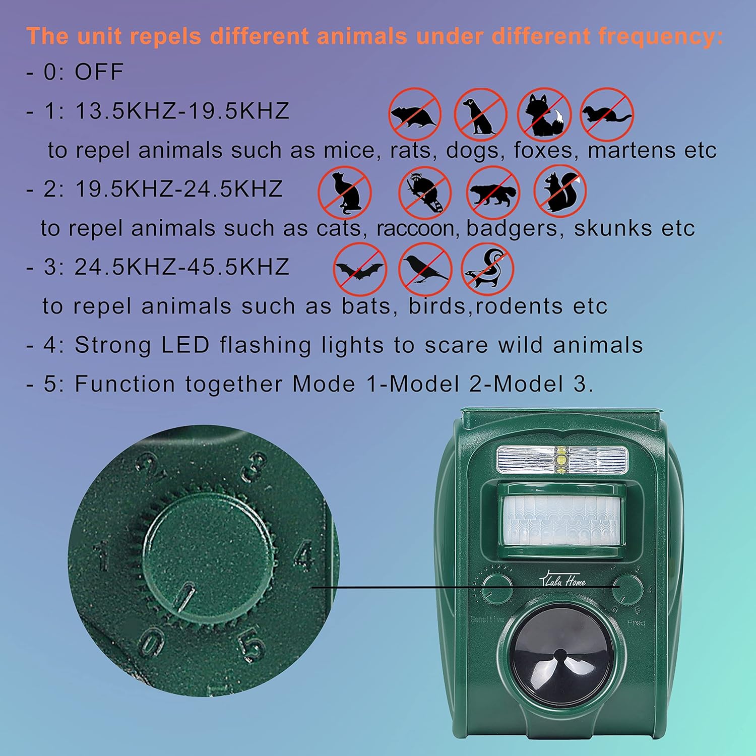 - Real-world relief for common yard intruders. Modes span lower and higher ultrasonic bands with an optional alarm, so you can target the species that actually bother you, such as cats, raccoons, rabbits, squirrels and foxes. The Lulu Home listing outlines five selectable modes by frequency range to help you tune the response.