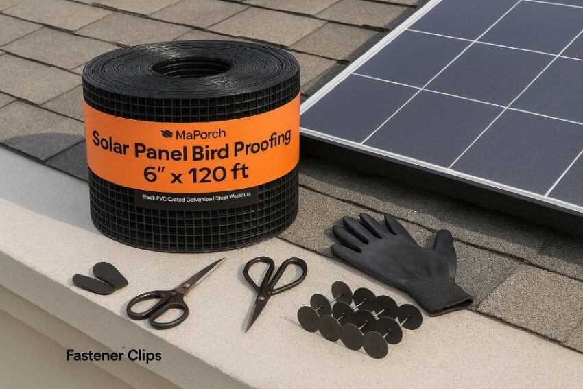 The MaPorch 6″x120FT Solar Panel Bird Proofing Mesh Kit, With 60 clips is a full perimeter guard that closes the 2 to 5 inch gap around most roof-mounted arrays so birds and small animals cannot crawl under your panels. The mesh is galvanized steel with a UV-stable black PVC coating that blends with panel frames and is built for weather on the roof. Industry makers of solar exclusion mesh use the same formula, that is half inch openings in galvanized steel with a black PVC coat, because it blocks pests while still letting air move under the array.